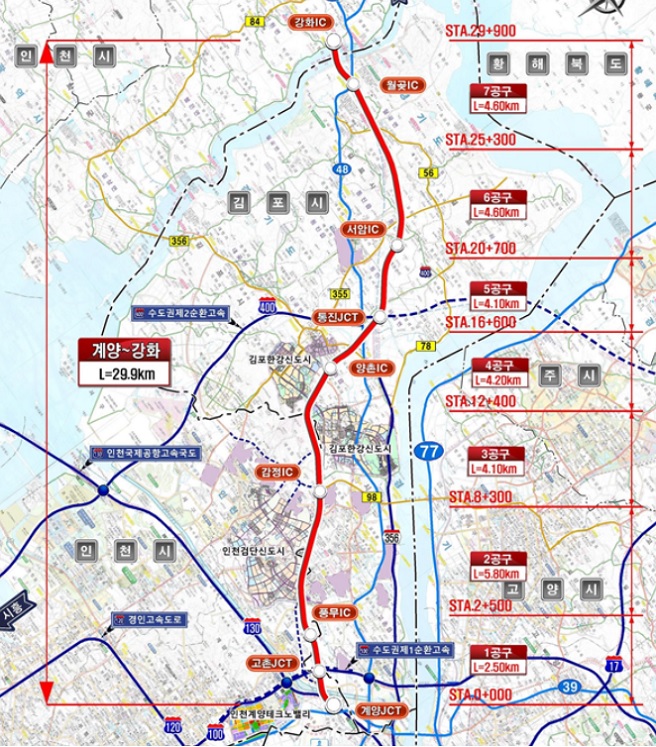 계양∼강화 고속도로는 인천 계양구 상야동에서 검단신도시, 김포한강신도시, 강화군 강화읍을 잇는 총연장 29.92km의 고속도로를 놓는 것으로, 총 7개 공구로 나뉜다.