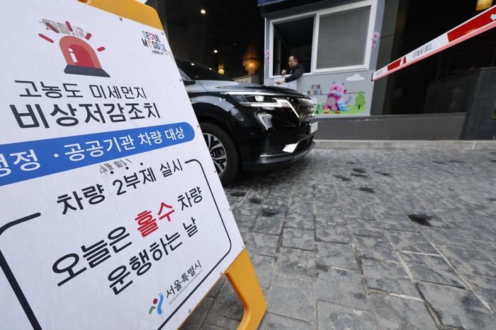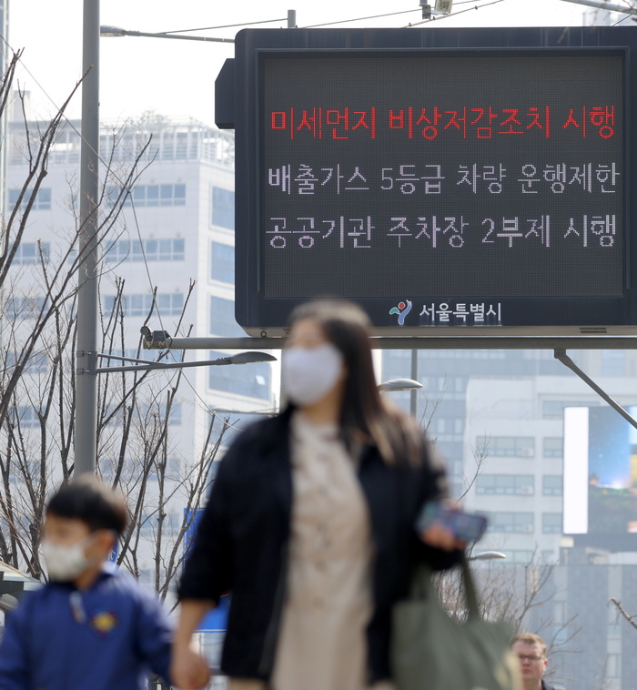 수도권과 충남 지역에 초미세먼지 비상저감조치가 시행된 17일 서울 중구 시청역 앞에 설치된 전광판에 미세먼지 비상저감조치에 따른 안내문이 표시되고 있다.