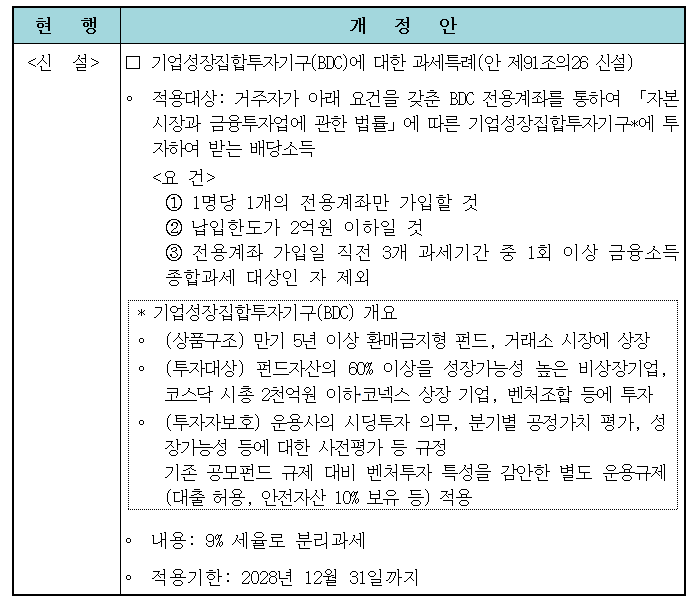 | BDC에 대한 배당소득 과세특례 신설 내용. / 자료=국회 제공 |