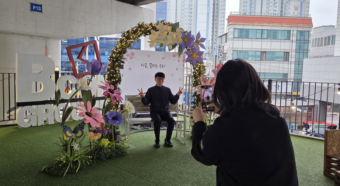 | 새롭게 조성된 All-day 비콘 플라워 가든 포토존에서 촬영이 한창이다. / 사진 : 부산시설공단 제공 |