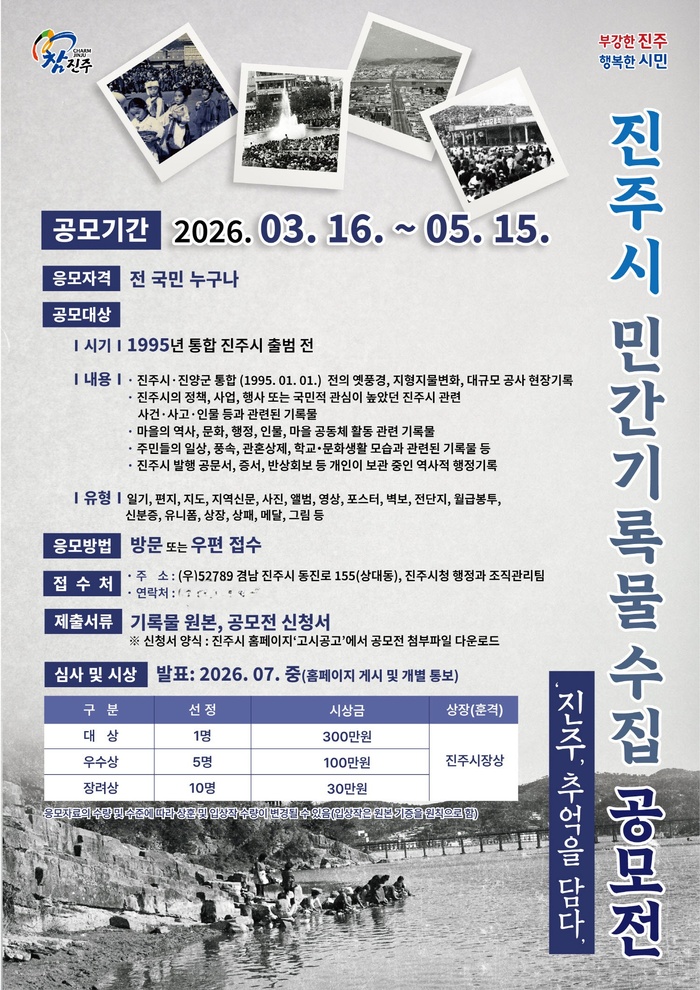 접수된 기록물은 심사를 거쳐 대상 1명(300만 원), 우수상 5명(각 100만 원), 장려상 10명(각 30만 원)을 선정해 시상할 예정이며, 결과는 오는 7월 중에 진주시청 누리집 에 게시 및 개별 통보한다.