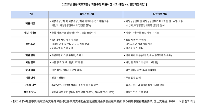 구조적 변화도 주목된다. 일본 정부는 자율주행 지원을 중점지원과 일반지원으로 이원화했다. 중점지원은 교통공백이 심각한 지역에서 교통 체계 전체를 재설계하는 사업이 대상이다. 사업당 최대 4억엔(약 37억원)까지 지원되며, 실증을 넘어 상용화 단계까지 이어진다. 일반지원은 레벨4 도입을 준비하는 사업으로, 사업당 최대 2억엔(약 19억원)이 상한이다. 양쪽 모두 정부 80%, 지자체 20% 부담이다.