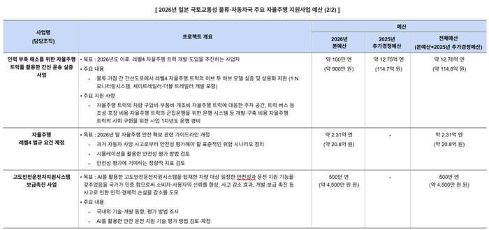 예산 규모가 전략의 진정성을 보여준다. 상위 사업인 ‘교통공백지대 해소를 위한 지역 교통 체계 재설계 사업’의 2026년 전체 예산은 2025년 추가경정 424억엔(약 3965억원)을 포함해 총 688억엔(약 6192억원)이다. 핵심인 ‘자율주행 사회구현추진사업’ 본예산은 205억6000만엔(약 1923억원)이며, 추가경정 중 일부도 투입됐다.