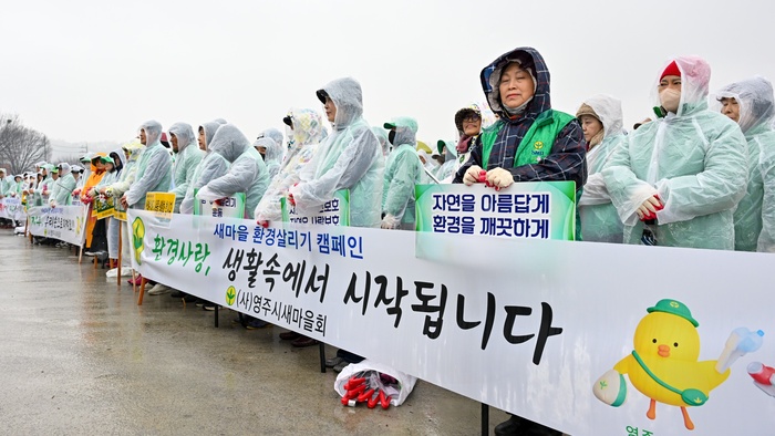 | 영주시새마을회가 봄비를 맞으며 환경정화에 나서고있다. / 사진 : 영주시청 제공 |