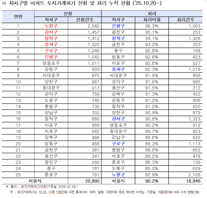 18일 서울시에 따르면 토지거래허가 누적 신청 건수(2만 895건) 중 서울 외곽 자치구 신청 비중은 지난해 10월 53.6%에서 올해 2월 67.2%로 치솟았다. 반면 강남 3구와 용산구 비중은 같은 기간 27.1%에서 11.2%로 절반 이상 줄어들었다. 거래 중심축이 강남권에서 강북(노원ㆍ도봉 등)과 서남권(강서ㆍ관악 등)으로 이동한 결과다.