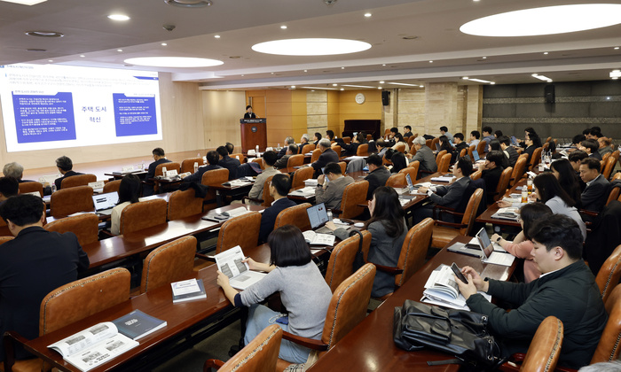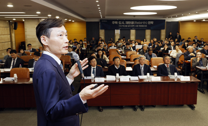 한국건설산업연구원 주최로 18일 서울 강남구 건설회관에서 열린 ‘주택ㆍ도시, 재탄생(Rebirth) 전략’ 세미나에서 장우철 국토부 주택정책관이 현 정부의 주택정책 방향에 대해 발표하고 있다.