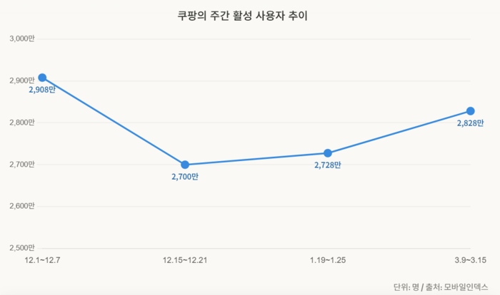 쿠팡 이용자 수는 유출 직후 시스템 점검 목적의 접속이 몰리며 일시적으로 늘었다가 실제 탈퇴가 이어지면서 2600만 명대까지 빠졌다. 이후 쿠팡이 지난 1월 15일 피해 고객에게 1인당 최대 5만원 상당의 구매 이용권을 지급하면서 2700만 명대로 반등했고, 3월 들어 2800만 명대까지 올라왔다.