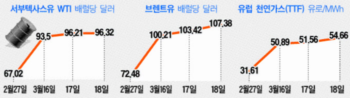 19일 금융권에 따르면 이스라엘, 이란 간 에너지공급망 타격 소식에 이날 브렌트유는 배럴당 107.38달러로 전일 대비 3.8% 치솟았다. 장중엔 110달러선도 넘어선 가운데, 유럽 천연가스(TTF) 가격 역시 54.66달러로 6.0% 급등했다.