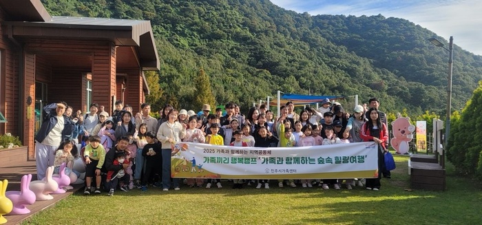 | 가족끼리 행복캠프 '가족과 함께하는 숲속 힐링여행' 단체 기념 촬영 모습. / 사진 : 진주시 제공 |