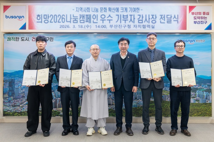 부산진구(구청장 김영욱)는 지난 18일 ‘희망2026 나눔캠페인 우수기부자 감사장 전달식’을 개최하고, 캠페인 기간 이웃사랑을 실천한 우수 기부자에게 감사장을 전달했다고 19일 밝혔다.