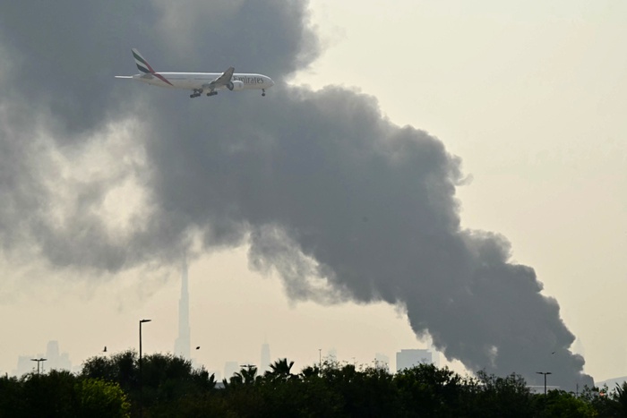 | 3월 16일 두바이 국제공항 인근 화재로 발생한 연기 사이를 에미레이트 항공기가 지나가고 있다./사진: AFP=연합 |