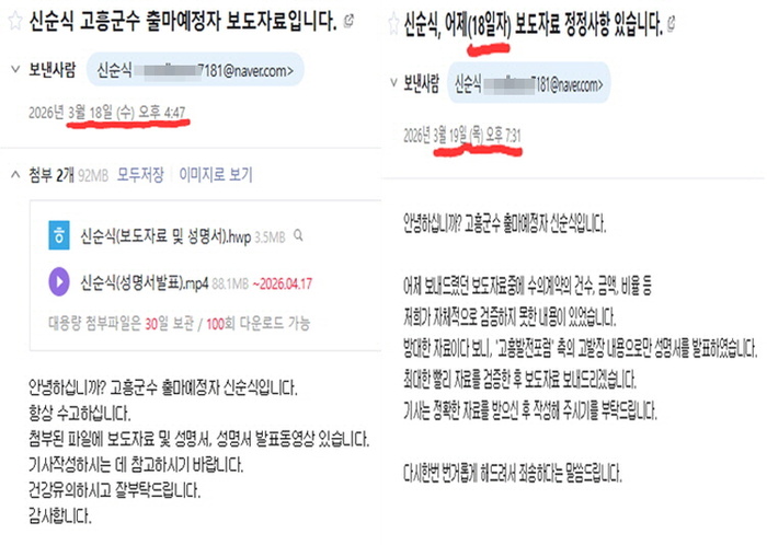 [대한경제=위종선 기자] 전남 고흥군수 선거를 앞두고 제기된 수의계약 비리 의혹이 '검증 논란'으로 번지고 있다. 의혹을 제기한 신순식 예비후보가 하루 만에 핵심 수치의 검증 부족을 인정하면서 정정 보도자료를 냈다.