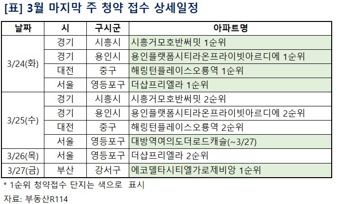 22일 부동산R114에 따르면 이번주에는 일반분양 2117가구를 포함해 2346가구가 청약에 들어간다. 서울 영등포구, 경기 용인시, 부산 강서구 등에 위치한 6개 단지에서 진행된다. 이는 지난주 5645가구(일반분양 2837가구)보다 3299가구 줄어든 것이다.