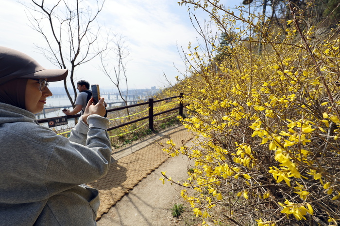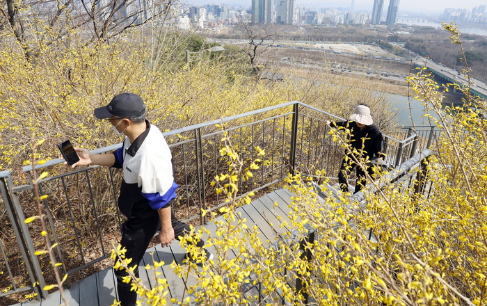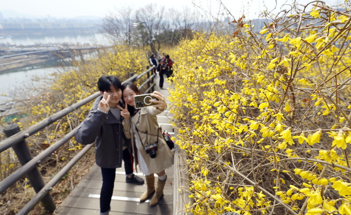 서울의 낮 최고 기온이 18도를 기록하면서 포근한 날씨를 보인 22일 서울 성동구 응봉산을 찾은 시민들이 활짝핀 개나리길을 산책하며 사진으로 추억을 남기고 있다.