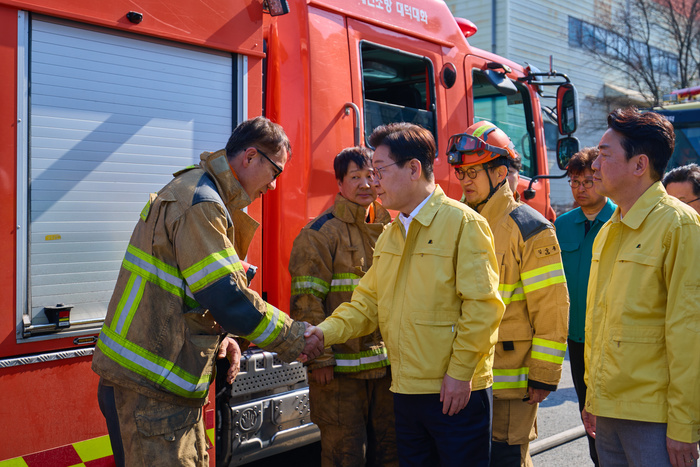 | 이재명 대통령이 21일 대전 대덕구 자동차 부품 제조 공장 화재 현장을 찾아 소방관들을 격려하고 있다. [청와대 제공] |