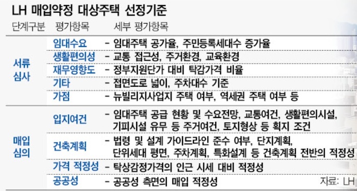 LH는 서류심사를 사업자가 통과한 뒤 거치게 되는 매입심의 단계에서도 입지여건ㆍ건축계획ㆍ공공성을 비롯해 ‘가격 적정성’이라는 평가항목을 제시했다. 여기서 가격 적정성은 ‘탁상감정가격의 인근 시세 대비 적정성’을 검토하겠다는 의미로 설명됐다.