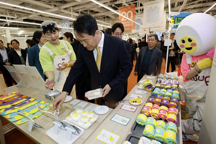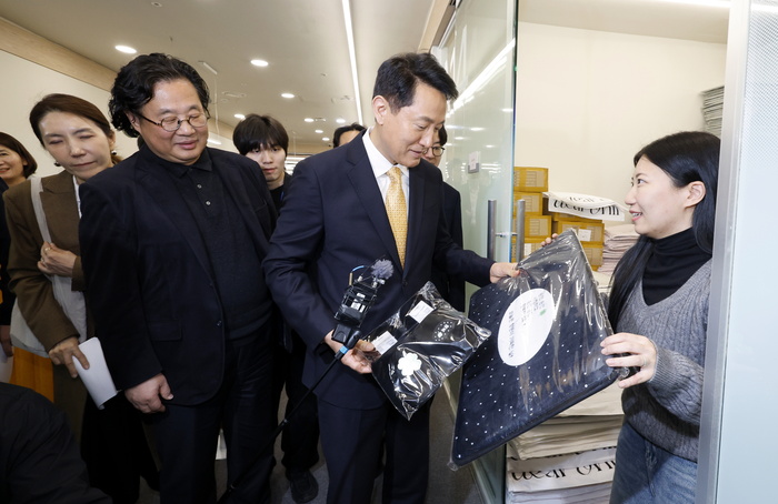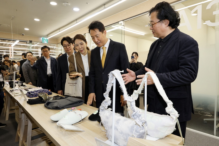 24일 서울 중구 동대문 밀리오레에서 열린 서울디자인창업센터 동대문캠퍼스 오픈식에서 오세훈 서울시장이 신진 디자이너들의 작품을 살펴보고 있다. 서울디자인재단은 동대문디자인플라자(DDP) 개관 12주년을 맞아 동대문 상권과 협력해 공실 상가를 청년 디자이너 창업 거점으로 재탄생시켜 이날 오픈했다.