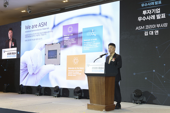 | 2026 투자유치 설명회’ 에서 ASM 코리아 김대연 부사장이 화성 입주 성공사례를 발표하고 있다. / 사진 : 화성시 제공 |