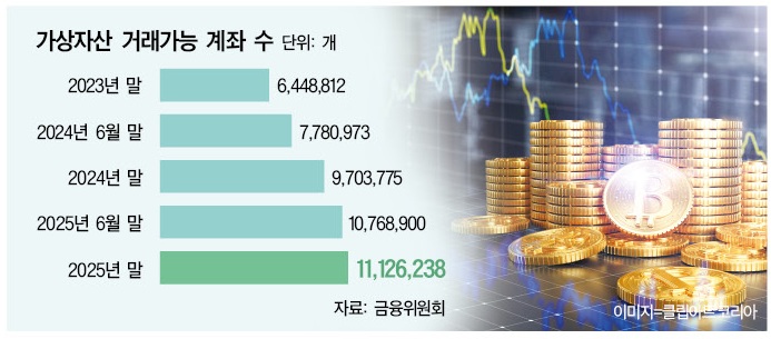 금융위원회 금융정보분석원이 25일 내놓은 ‘2025년 하반기 가상자산사업자 실태조사’ 결과를 보면, 작년 말 기준 국내 25개 가상자산 사업자의 거래가능 이용자 계정 수는 1113만개다. 가상자산 계좌 수는 2024년 970만개에서 작년 상반기에는 1077만개로 늘어났고, 지난해 하반기에 3%가 더 증가하면서 1100만개 위로 올라갔다.