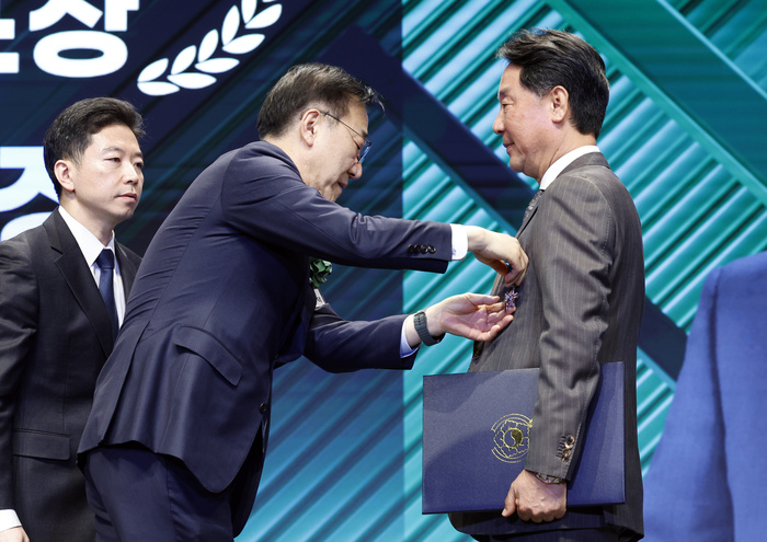 | 서진철 ㈜에이치케이건축사사무소 대표이사(사진 우)가 금탑산업훈장을 수상하고 있다. /사진=안윤수기자 ays77@ |