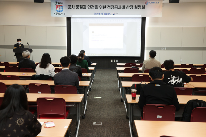 26일 조달청에 따르면, 이날 일산 킨텍스에서 진행 중인 ‘코리아 나라장터 엑스포 2026’에서는 수요기관과 설계사, 건설적산회사 관계자들이 참석한 가운데 공사 안전과 품질을 위한 적정공사비 산정 설명회를 개최했다. 이는 조달청이 축척한 공사원가계산 경험가 노하우를 공유하기 위한 자리다.