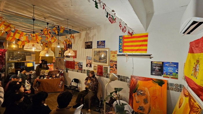 골목에 위치한 작은 가게에는 스페인 국기 가랜드와 FC바르셀로나 팀기, 각종 모임과 공연 포스터, 감각적인 유화작품들이 여기저기 걸려있다. 제멋대로인 듯 일종의 규칙과 문화를 품고 있는 공간을 보고 있노라면 주인장의 정체가 궁금해진다.