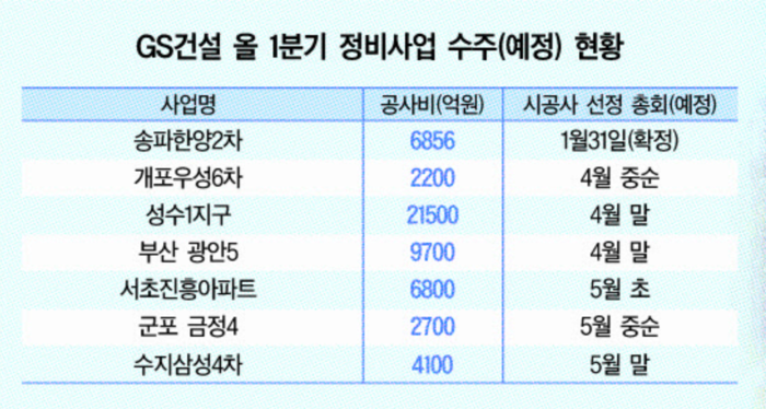 수의계약 행보의 신호탄은 1월31일 시공사로 선정된 송파한양2차 재건축이다. GS건설은 지난해 9월과 12월 두 차례 입찰 모두 단독 응찰하며 수의계약 요건을 충족했다.