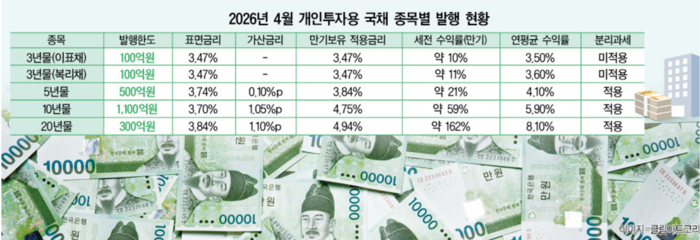 다만 3년물에는 조건이 있다. 5년물 이상에 적용되는 이자소득 분리과세 혜택이 없고, 이번엔 가산금리(정부가 덤으로 얹어주는 추가 금리)도 붙지 않는다. 정부는 “최근 국고채 3년물 금리(3.470%)가 이미 충분히 오른 점, 다른 금융상품과의 수익률 균형 등을 감안했다”고 설명했다. 역설적으로 이는 5년물 이상 장기채에 혜택을 집중시켜 개인 투자자를 장기물로 유도하려는 설계로도 읽힌다.