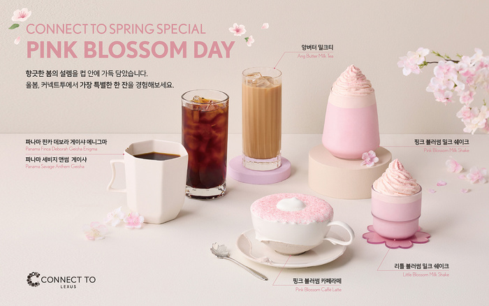 렉서스 복합문화공간 ‘커넥트투’가 봄 시즌을 맞아 한정 음료와 프리미엄 드립커피 등 신메뉴 6종을 선보인다. 벚꽃 테마 음료 3종(핑크 블러썸 카페라떼ㆍ밀크쉐이크 등)은 5월 31일까지 한정 판매되며, 렉서스 영파머스 김세환 농부와 협업한 ‘앙버터 밀크티’도 함께 출시한다.