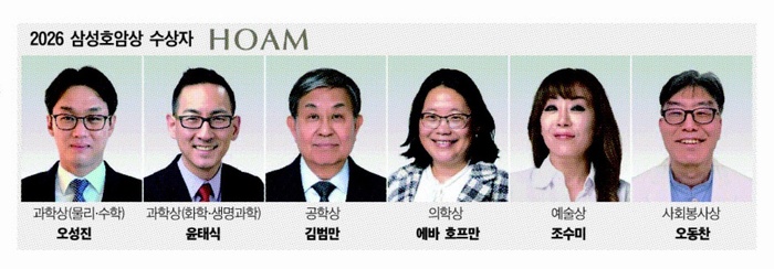 [대한경제=심화영 기자] 호암재단이 과학, 공학, 의학, 예술, 사회봉사 등 각 분야에서 인류 발전과 삶의 질 향상에 획기적으로 기여한 6명을 ‘2026 삼성호암상 수상자’로 선정해 1일 발표했다. 올해 수상자들은 30대 신예 석학부터 70대 평생 헌신자까지 전 세대를 아우르며, 대한민국을 넘어 글로벌 무대에서 독보적인 업적을 쌓아온 인물들로 채워졌다.