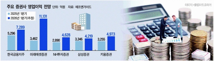 한국투자증권을 자회사로 둔 한국금융지주는 올해 1분기 영업이익이 전년 동기 대비 37.6% 늘어난 7289억원으로 전망됐고, NH투자증권은 올해 1분기 영업이익으로 4628억원을 거둬 작년 1분기보다 60.1% 증가할 것을 추정됐다. 삼성증권과 키움증권도 올해 1분기 영업이익이 작년 1분기와 비교해 각각 26.0%와 15.2%씩 확대될 것으로 관측됐다.