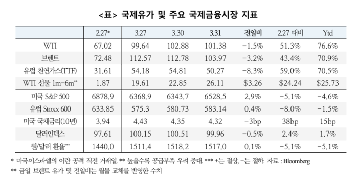국제유가도 하락세로 돌아섰다. 중동 긴장 완화 기대 속에 서부텍사스산원유(WTI)는 4거래일 만에 하락하며 배럴당 101.38달러에 마감했다.