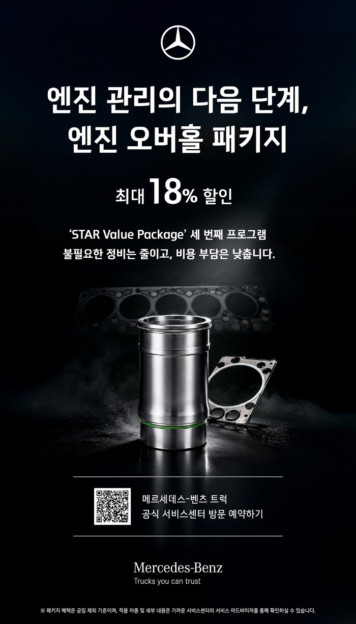 메르세데스-벤츠 트럭 공식 수입사 스타트럭코리아가 ‘엔진오버홀 패키지’를 출시했다. 실린더 라이너ㆍ가스켓ㆍ피스톤ㆍ베어링 등 엔진 핵심 부품을 통합 구성했으며, 순정부품 가격 기준 공임 제외 최대 18% 할인 혜택을 제공한다.
