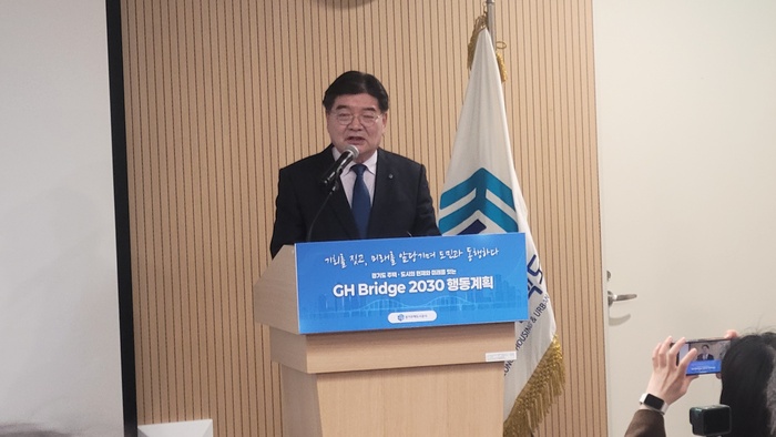 | 김용진 GH 사장이 ‘GH Bridge 2030 행동계획’ 돌입하는 내용을 발표하고 있다. / 사진 : 박범천 기자 |