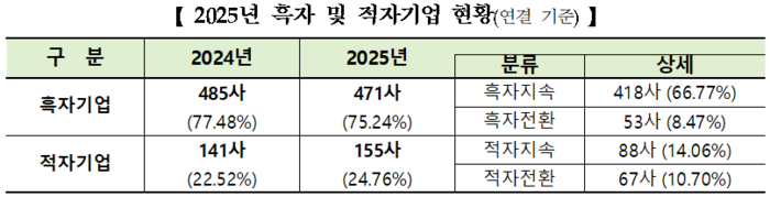 2일 한국거래소의 유가증권시장 12월 결산법인 2025사업연도 연결 결산실적을 보면 701사 중 75사(사업보고서 제출 기한 연장, 신규 설립·분할·합병, 감사의견 비적정, 금융업 등)를 제외한 626사 가운데 순이익 기준 흑자기업은 471곳(75.24%)으로 전년 485곳(77.48%)보다 12곳(2.24%포인트) 감소한 것으로 집계됐다. 그러나 적자기업은 141사(22.52%)에서 14사(2.24%포인트) 늘어난 155사(24.76%)다.