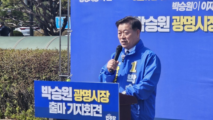 | 박승원 시자이 지난 2일 시청 앞 잔디 광장에서 6.3지방선거 광명시장 출마 기자회견을 갖고 "이재명 정부와 함께 잘 먹고 잘 사는 유능한 도시 광명을 만들겠다"고 선언했다. / 사진 : 박범천 기자 |