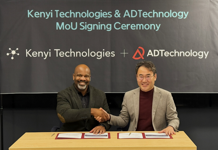 | 박준규 에이디테크놀로지 대표(오른쪽)와 빈센트 롱크(Vincent Loncke) 케니테크놀로지스 대표가 MOU 체결 후 기념촬영을 하고 있다. /사진: 에이디테크놀로지 제공 |