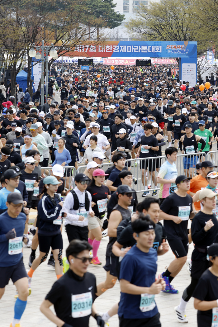 <대한경제> 주최로 4일 서울시 마포구 상암월드컵공원 평화의광장에서 열린 ‘SAFE KOREA’ 제17회 대한경제 마라톤대회에서 하프코스 참가자들이 힘차게 출발하고 있다.