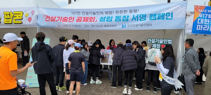 # 한국건설기술인협회도 임직원과 가족 등 100여명이 참가해 행사 열기를 더했다. 박종면 협회장은 “건설인과 그 가족들이 함께 뛰고 걷는 이 자리는 단순한 마라톤을 넘어 건설인의 자긍심을 높이는 축제”라며 “우리나라 건설인 수는 100만 명, 가족까지 포함하면 440만 명에 달하는 만큼 이런 행사가 더욱 자주 열리길 바란다”고 말했다. 특히 협회는 이번 행사장에 서명 캠페인존을 별도로 마련해 건설기술인 공제회 설립을 위한 서명운동을 펼쳤다. 서명 캠페인은 김현아 전 국회의원의 아이디어로 성사됐다. 김 전 의원은 “요즘 건설 산업이 어렵지만 지금은 엔지니어의 시대다. 건설기술인들은 영원하다”며 “건설기술인 공제회 설립 당위성을 알리기 위해 기술인협회 여성위원회 위원들과 봉사활동을 나왔다“고 말했다. 김 전 국회의원이 동참한 캠페인존 운영부스는 건설인 마라톤 참가자들의 발길이 이어지며 행사 내내 북적였다.