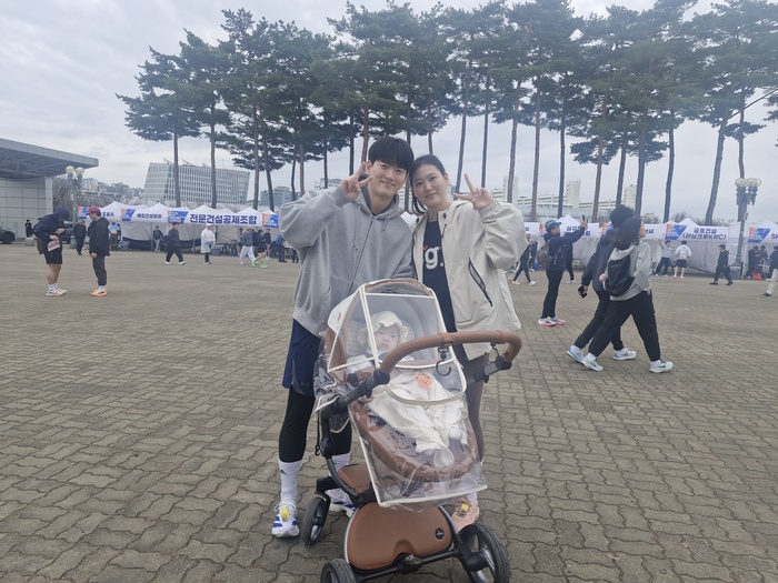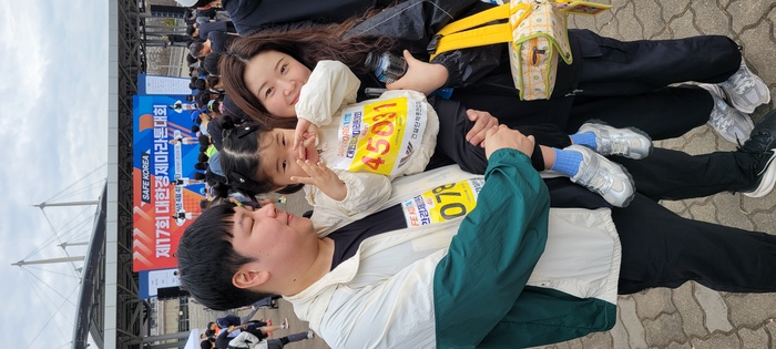 | 대한경제 마라톤 행사에 참석한 2023년생 권나은양(사진 가운데)과 권석진(사진 왼쪽)ㆍ이난영 부부가 기념사진을 촬영하고 있다. / 사진 : 한형용기자 je8day@ |