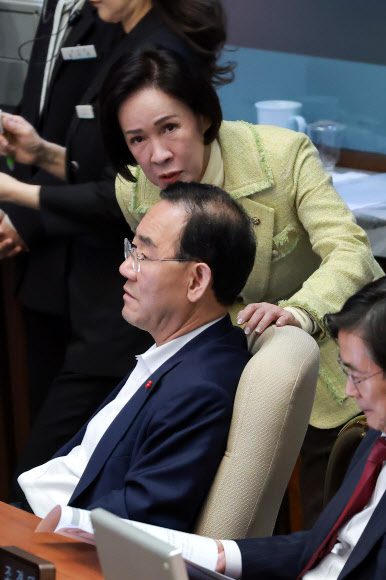 | 지난달 31일 국회에서 열린 3월 임시국회 제3차 본회의에서 주호영 국회부의장이 국민의힘 대구시당위원장인 이인선 의원과 대화하고 있다./사진:연합 |