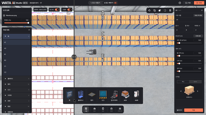 이러한 문제를 해결하기 위해 개발된 SaaS 기반 디지털 트윈 솔루션 WATON View는 물류관리자가 직접 창고를 디지털 공간으로 구현하고 운영할 수 있으며, 와따에이아이의 디지털 트윈 저작 도구인 WATON Studio를 기반으로 별도의 개발 없이도 직관적인 환경에서 물류센터를 디지털화할 수 있다.