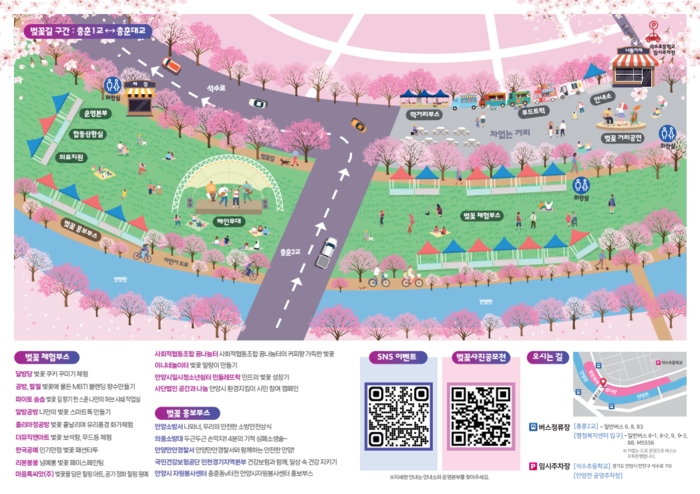 행사장 곳곳에는 벚꽃 체험부스와 유관기관 홍보·캠페인 부스, 푸드트럭존, 소울음아트센터 작품 전시 등이 운영되며, 벚꽃길 전 구간에는 ‘뮤직 스트리트’를 조성해 방문객들에게 풍성한 봄 축제 분위기를 선사한다.