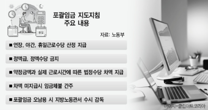 정액급 약정처럼 기본급과 수당 등을 구분하지 않거나, 정액수당처럼 연장ㆍ야간ㆍ휴일 수당 구분없이 임금을 산정하면 안 된다는 점도 분명히 했다. 통상 포괄임금으로 불리는 정액급ㆍ정액수당ㆍ고정OT를 체결했더라도 실제 근로시간에 따른 차액분을 지급하지 않으면 임금체불에 해당한다는 게 노동부 해석이다.