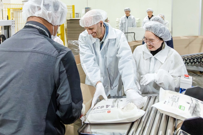 | 해롤드 로저스 쿠팡 임시대표가 전병순 광복영농조합 대표와 함께 상품 공정을 둘러보고 있다. /사진: 쿠팡 제공 |
