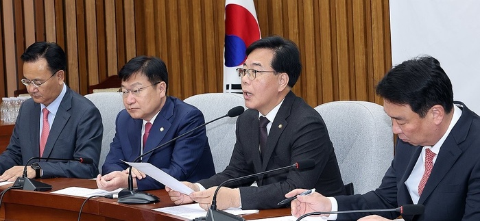 | 국민의힘 송언석 원내대표가 10일 국회에서 열린 원내대책회의에서 발언하고 있다. 왼쪽부터 유상범 원내운영수석부대표, 정점식 정책위의장, 송 원내대표, 정희용 사무총장./사진:연합뉴스 |