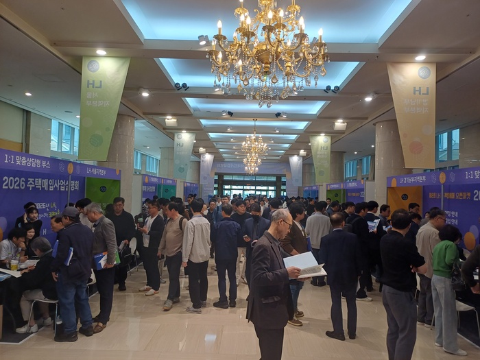 | 14일 LH 경기남부지역본부에서 열린 ‘2026년 주택 매입 사업설명회’에서 사업자들이 상담 부스를 방문하고 있다. LH에 따르면 이날 오후 3시30분 기준 1700여명이 행사장을 찾았다. / 사진: 황은우 기자. |
