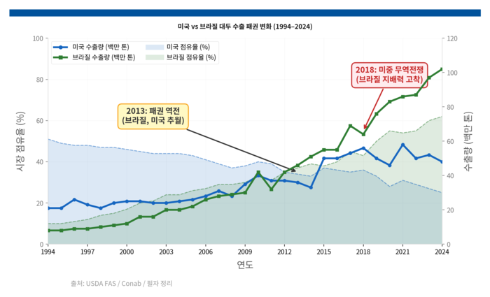 이 전환에 속도를 붙인건 지경학(geoeconomics)이었다. 2018년 미중 무역전쟁 1라운드 때 중국이 미국산 대두에 25% 보복관세를 부과하자, 브라질산 대두가 그 공백을 메웠다. 관세 충격으로 미국산 대두 가격이 급락하고 수요는 브라질로 향했다. 중국의 미국산 대두 수입은 2017년 약 3,300만 톤에서 2018년 약 1,700만 톤으로 절반 가까이 급감했다. 브라질이 그 공백을 채웠고, 그 구조는 이후에도 되돌아오지 않았다. 2025년 트럼프 2기 행정부가 관세를 재연하면서 같은 구도가 다시 작동하고 있다. 브라질은 이 구조적 전환의 최대 수혜자다. 대두 한 품목에서 브라질이 연간 1억 톤 수준인 중국 수입 수요의 70% 이상을 공급하는 시대가 됐다.