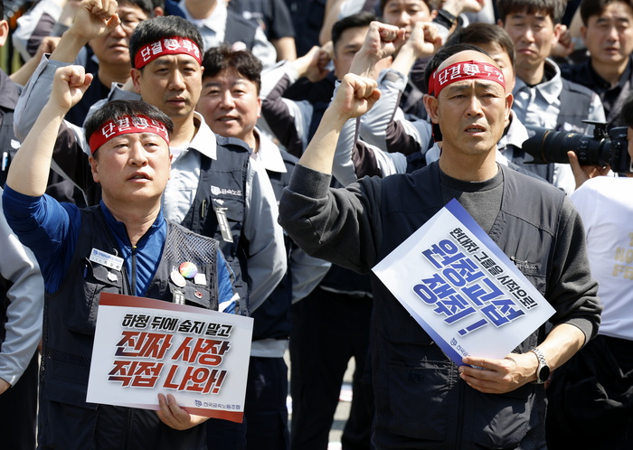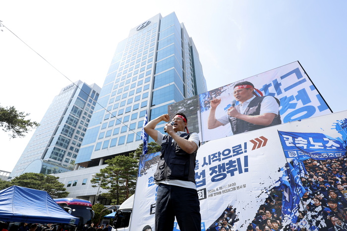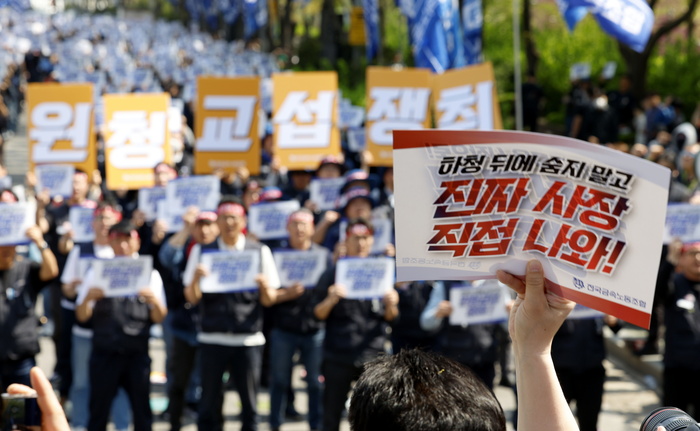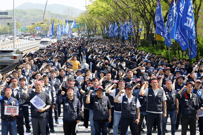 금속노조 조합원들이 15일 오후 서울 양재동 현대차그룹 본사 앞에서 조합원 약 1000명이 참석한 가운데 현대차그룹에 원청교섭을 요구하는 결의대회를 열고 있다.