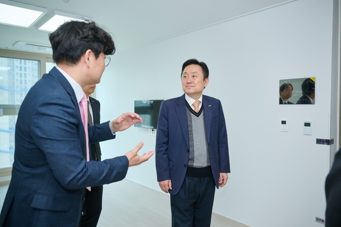 | 최인호 HUG 사장(오른쪽)이 청년안심주택에 방문해 현장을 점검하고 있다. / 사진: HUG 제공. |